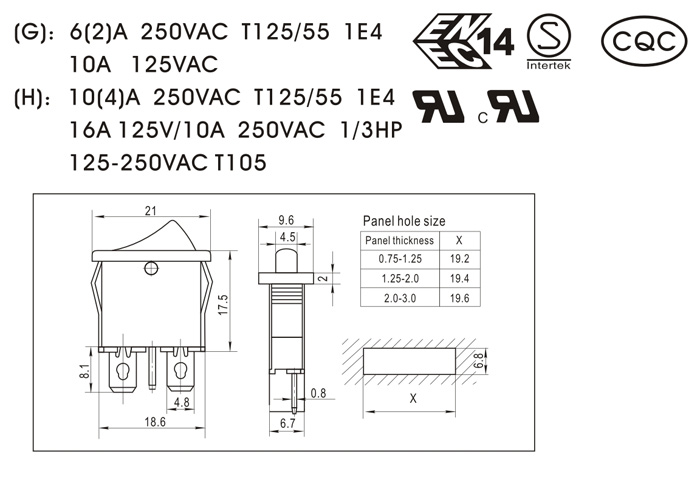 (G): 6(2)A 250VAC T125/55 1E4