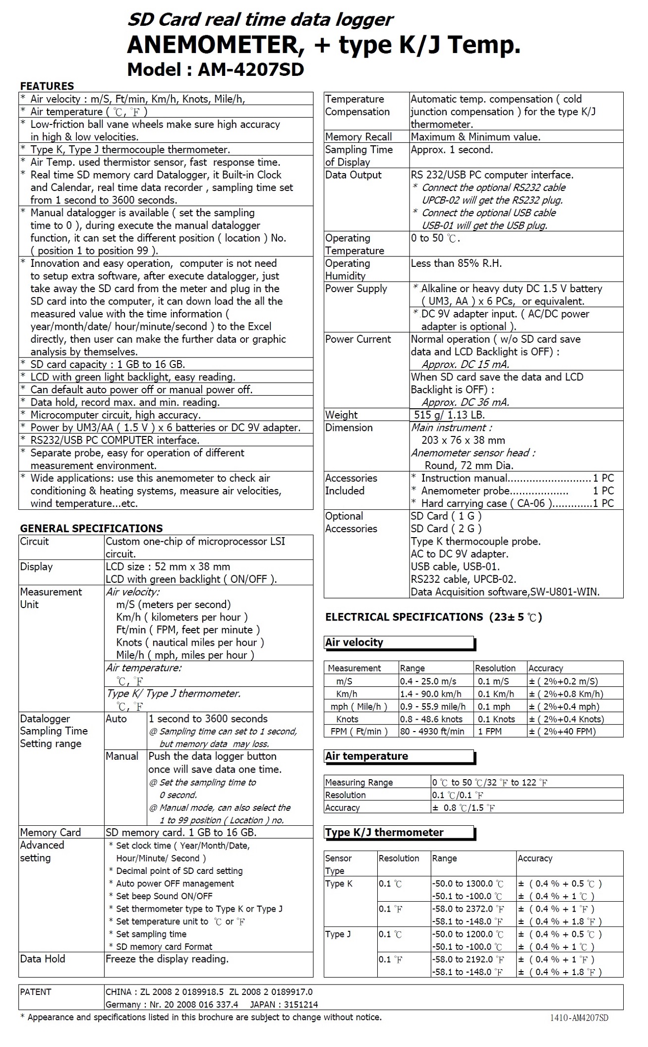 Product Name : ANEMOMETER Model : AM-4207SD 記憶式風速 溫度計