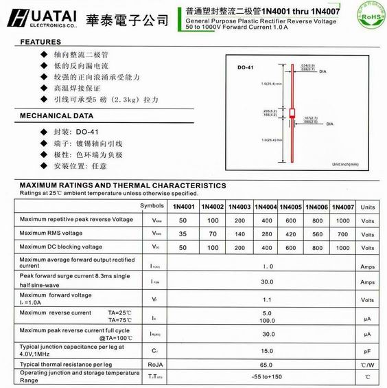 Product Name : | General Purpose Plastic Rectifier- 普通塑封整流二极管 1N4001 thru 1N4007 |
